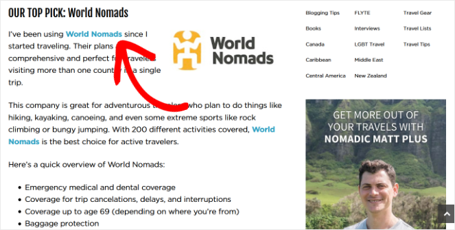 Here’s an example from the travel blog Nomadic Matt. He wrote an article about the 5 best travel insurance companies: